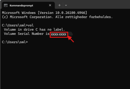 Step 6: Skriv følgende uden gåseøjnene ”vol” og tryk enter. Kopier Volume serialnumber is ”XXXX-XXXX” og brug på hjemmesiden (disk serialnumber). Husk at fjerne bindesteg på hjemmesiden.