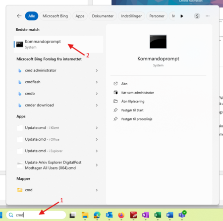 Step 5: Find dit disk serial number. Søg på CMD i din pc (1) og åben 'Kommandoprompt' (2)