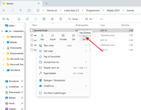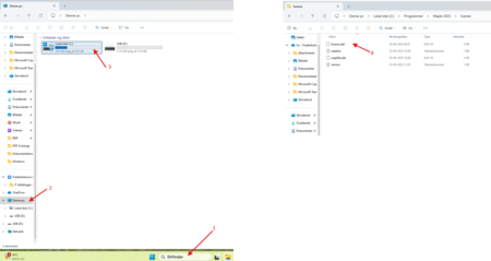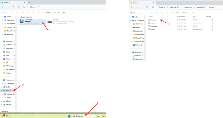 Step 9: Søg på stifinder (1), vælge ”denne PC” (2) og åben C:drev -> Programmer -> Maple 2025 -> Licens (3). Find Licens.dat filen og omdøb den til 'gammel fil' (4)