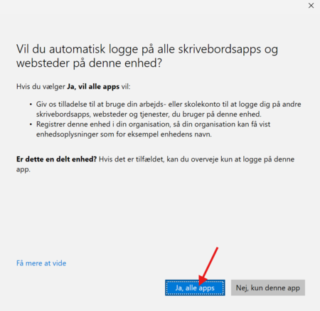 Step 10: Tryk 'Ja, alle apps' og du vil blive logget på med din skole login på alle Office 365 apps ved dette login.