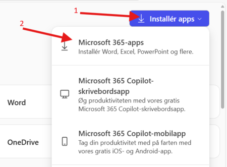 Step 4: Tryk på 'Installér apps' i højre side af browseren (1) og tryk derefter på 'Microsoft 365-apps' (2)