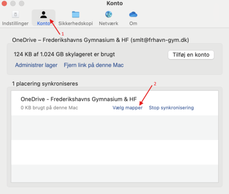 Step 2: Tryk på 'Konto' (1) og find OneDrive - Frederikshavns Gymnasium & HF og tryk på 'Vælg mapper' (2)