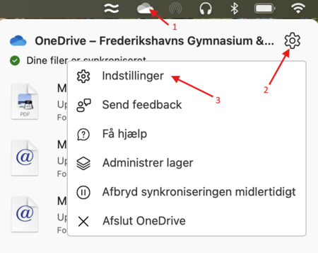 Step 1: Åben OneDrive (1). Tryk derefter på møtrikken øverst til højre (2) og vælg derefter Indstillinger (3)
