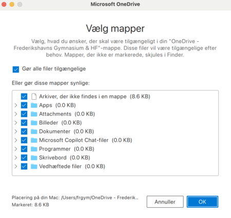 Step 3: Her ser du hvilke mapper, som er koblet sammen med OneDrive - Frederikshavns Gymnasium & HF, så når dine filer bliver gemt i følgende mapper, vil de også blive gemt på dine OneDrive skolekonto.