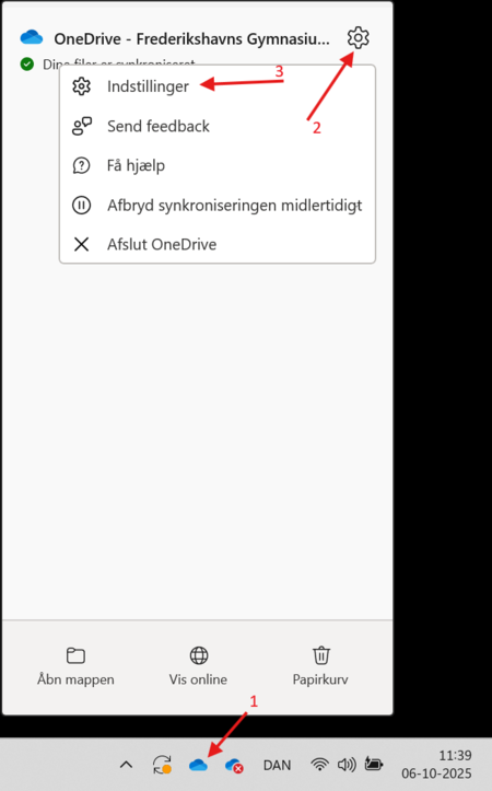 Step 1: Åben OneDrive (1). Tryk derefter på møtrikken øverst til højre (2) og vælg derefter Indstillinger (3)