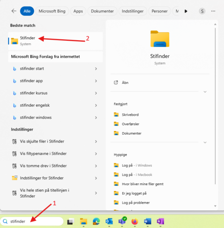 Step 4: Søg på 'Stifinder' (1) og åben derefter stifinder (2).