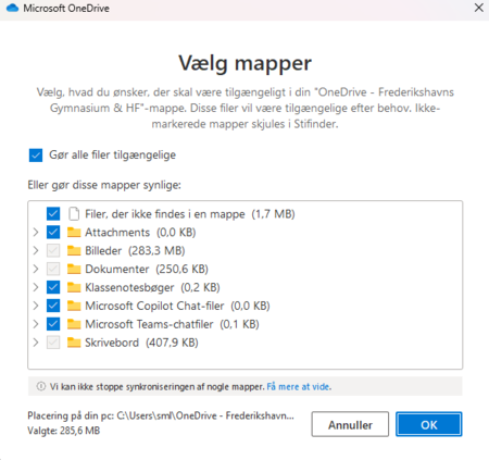 Step 3: Her ser du hvilke mapper, som er koblet sammen med OneDrive - Frederikshavns Gymnasium & HF, så når dine filer bliver gemt i følgende mapper, vil de også blive gemt på dine OneDrive skolekonto.