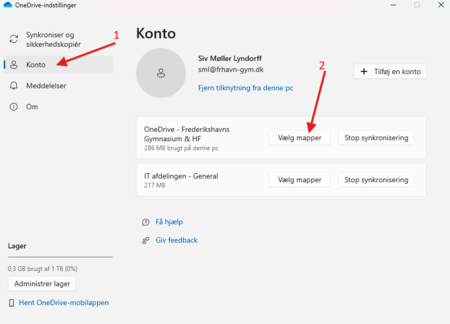 Step 2: Tryk på 'Konto' (1) og find OneDrive - Frederikshavns Gymnasium & HF og tryk på 'Vælg mapper' (2)