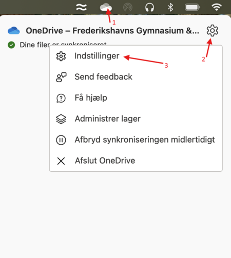 Step 1: Åben OneDrive (1). Tryk derefter på møtrikken øverst til højre (2) og vælg derefter Indstillinger (3).