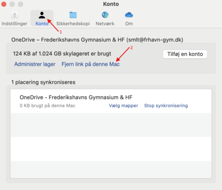 Step 2: Tryk på 'Konto' (1). vælg derefter 'Fjern link til denne Mac' (2) på den OneDrive konto det handler om.