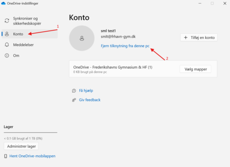 Step 2: Vælg 'Konto' (1) og tryk derefter på 'Fjern tilknytning fra denne PC' (2) på den OneDrive konto det handler om.