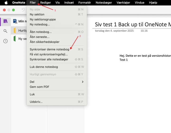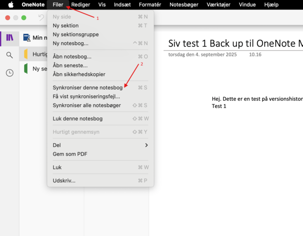 Step 1: Tryk på 'Filer' (1) og tryk derefter på ' Synkorniser denne notesbog' (2)