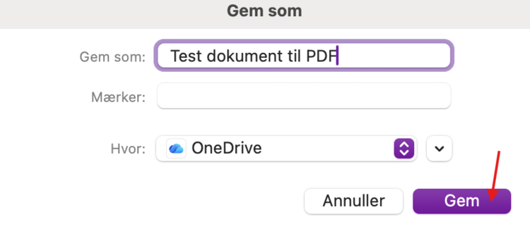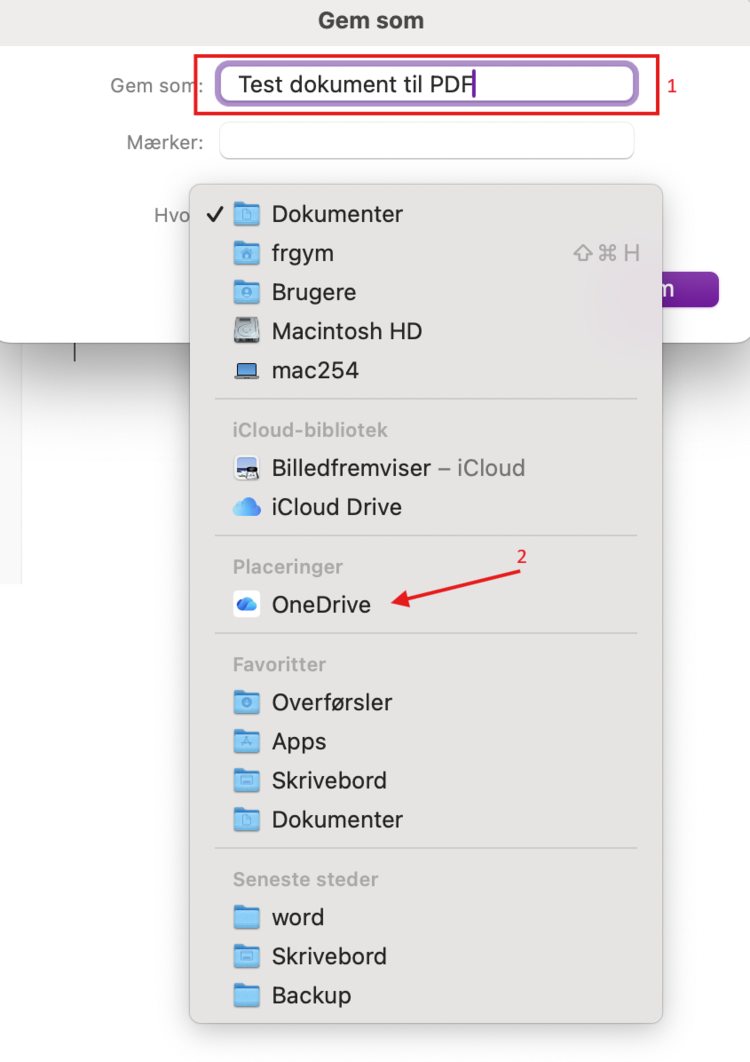 Step 2: Navngiv dit dokument (1) og vælg derefter at din fil skal gemmes på OneDrive - Frederikshavns Gymnasium & HF (2)