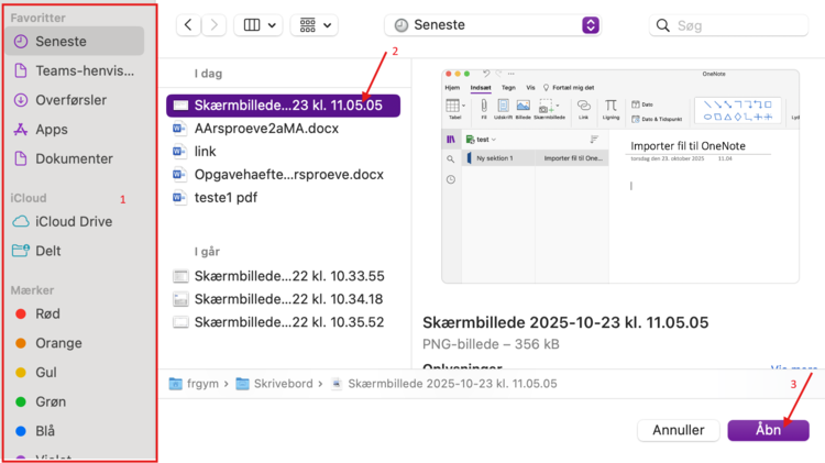 Step 2: Find hvor den fil du til impoterer er gemt (1) og vælg derefter filen (2) og tryk på 'Åben' (3)
