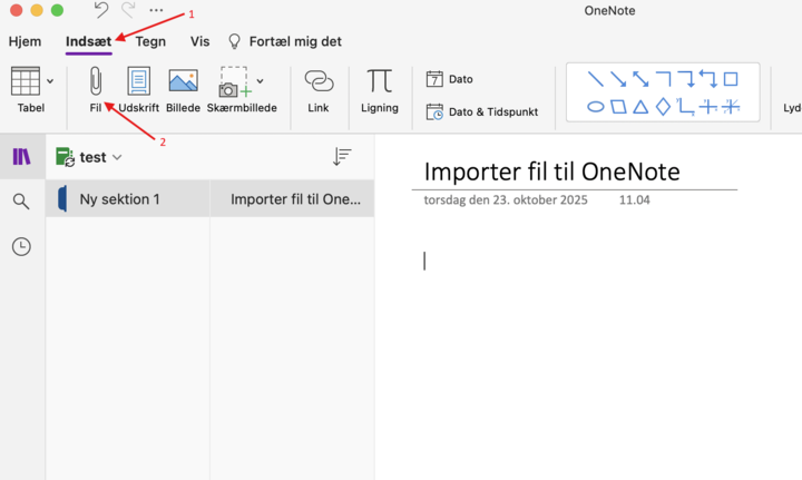 Step 1: Tryk på 'Indsæt' (1) og derefter på 'Fil' (2)