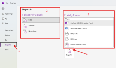 I (3) Kan du se hvilken type fil muligheder du har for at gemme. Tryk derefter Eksportér (4).