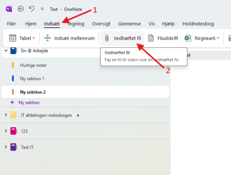 Step 1: Tryk på 'Indsæt' i menuen i OneNote (1) og vælg derefter 'Vedhæftet fil' (2)