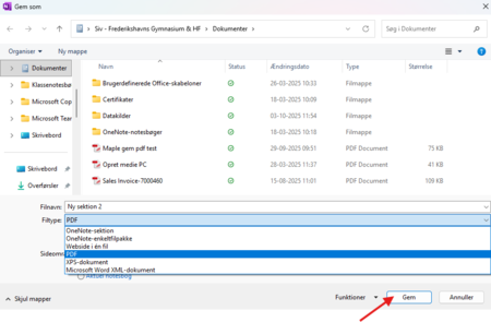 Step 3: Find mappen 'OneDrive - Frederikshavn Gymnasium & HF', navngiv dit dokument og vælg derefter filtype og tryk 'Gem'.
