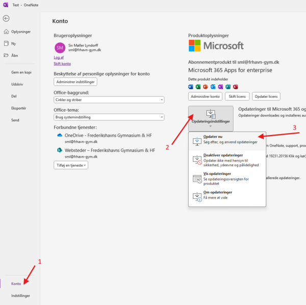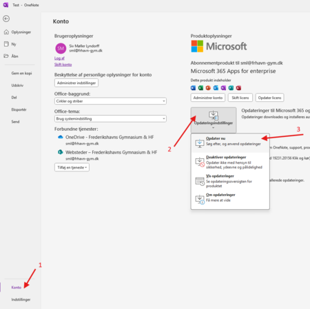 Step 2: Vælg 'konto' (1) og tryk derefter på 'Opdateringsinstillinger' (2) og 'Opdater nu' (3)
