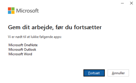 Step 4: Har du åbne apps fra Offie365, så gem dine dokumenter og tryk derefter fortsæt.
