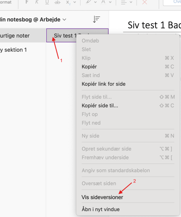 Step 1: Højre klik på notesbogen (1) og tryk derefter på 'vis sideversioner' (2). Der åbnes nu en liste med tidligere verisoner af din notesbog.