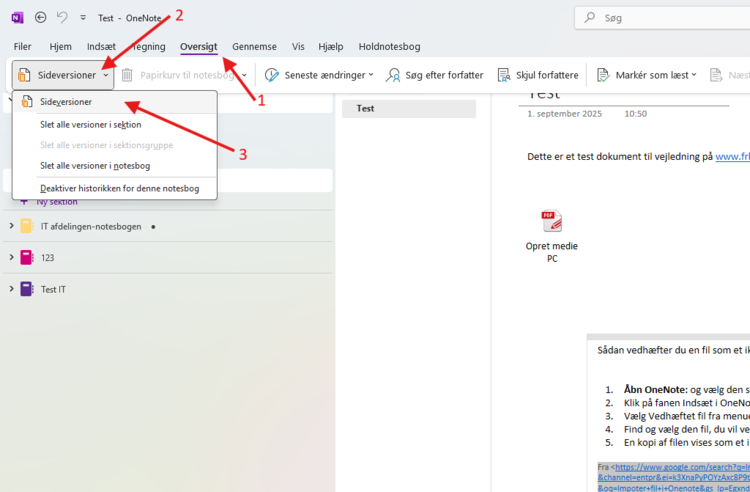 Step 1: Tryk på 'Oversigt' i menuen i OneNote (1) og tryk derefter på 'Sideversioner' (2) og vælg igen 'Sideversioner' (3)