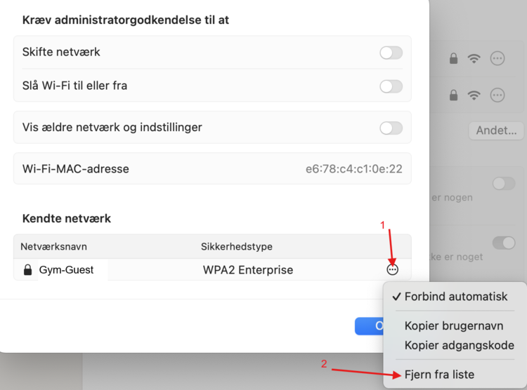 Step 3: Tryk på cirklen med tre prikker ud fra det netværk du skal glemme (1) og vælg derefter 'Fjern fra liste' (2)